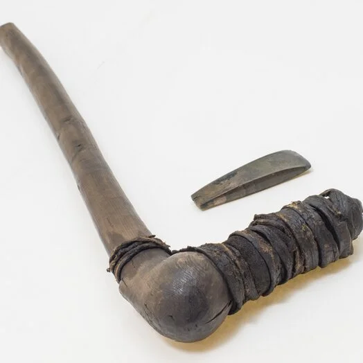 Ötzi lived in the Copper Age (late Neolithic tipping into Bronze Age). He carried an axe with a 99.7% copper blade on a yew haft (status symbol and serious tool), plus a flint dagger, unfinished bow, quiver, birch-bark containers, and a woven-grass cloak. Metallurgy was new in Europe; analysis shows the axe copper traveled ~500 km from Tuscany—yes, ancient supply chains.